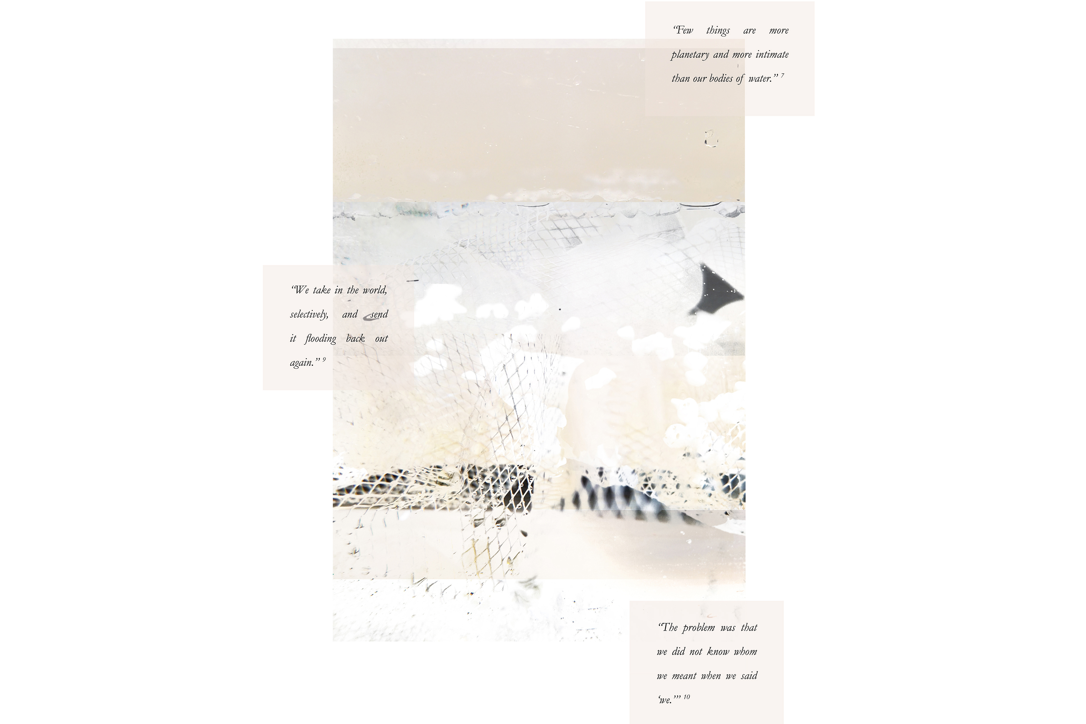 Hydrofeminism is the concept that we are all bodies of water and are therefore connected to other bodies of water. Water is the connection to past, current and future cycles of life. The initial experiments experiment with different textile meshes and water particulates. The various particulates can be thought of as types of pollution or as ambiguous materials at a decontextualized scale. The video links the layers of material experiments; this layering represents the cyclical nature of life and water and constitutes how bodies of water are connected to each other through the passing of time. The collage layers all of the previous experiments together. Collaging allows the information to be seen as connected entities rather than individual artefacts. The concept of decontextualized scale drawn from the photographs and the passing of time drawn from the video offer an opportunity to see these different interpretations of water in unison. This collage thus is a visual, tangible way to grapple with how water is comprised of overlapping trajectories that holds a multiplicity of scales — the molecular, the human body and the universe — all in one entity.