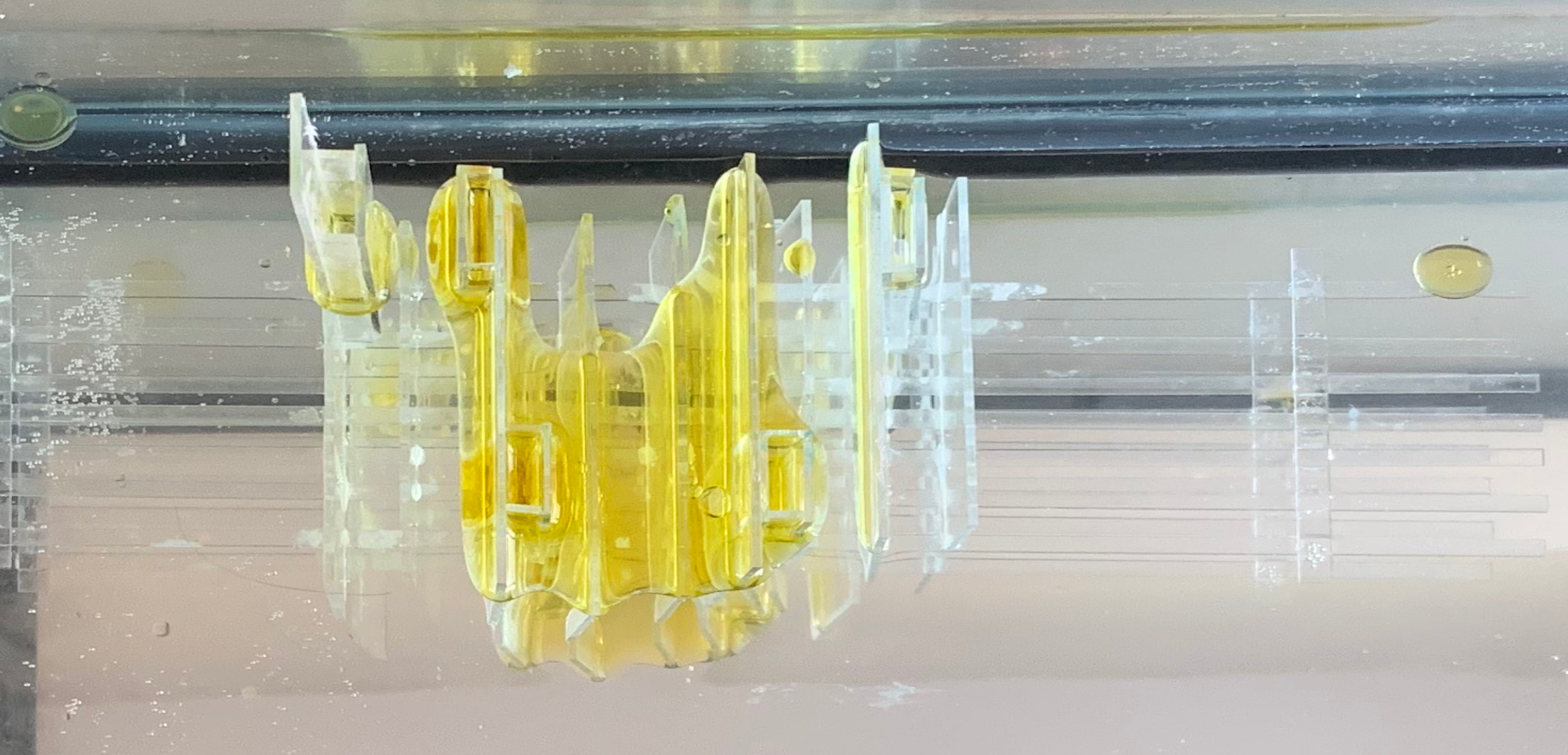 This project rehabilitates aquatic wildlife loss through buoyant ecologies that rely on bioremediation methods. The proposal builds on early model studies that explore interactions between vertical fins, surface oil, and small particles drawn to these oil pools. The proposal is an abstract translation of these model elements, and incorporates four processes. First, Reinstating (elaborate). Second, Benthos… elaborate. Third, Phytoplankton introduction elaborate… . Fourth, micro-plastic filtration elaborte.